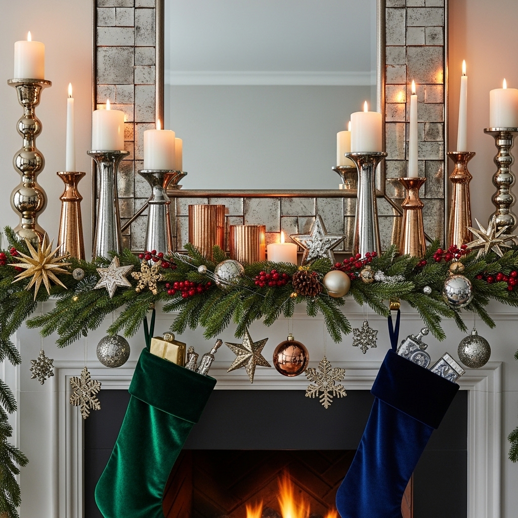 Add sparkle with metallic accents such as gold, silver, or copper candle holders, ornaments, or mirrors above the mantel reflecting the fireplace’s warm glow. Pair with jewel-toned accessories like velvet stockings in emerald or sapphire to amplify luxury.