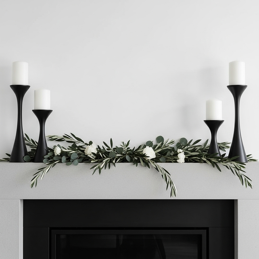 Choose a sleek, streamlined approach using a monochrome palette whites, grays, blacks with minimal ornamental elements. A couple of statement candleholders and a simple greenery garland can create elegance without clutter, perfect if you prefer clean lines over traditional hearth decorations.