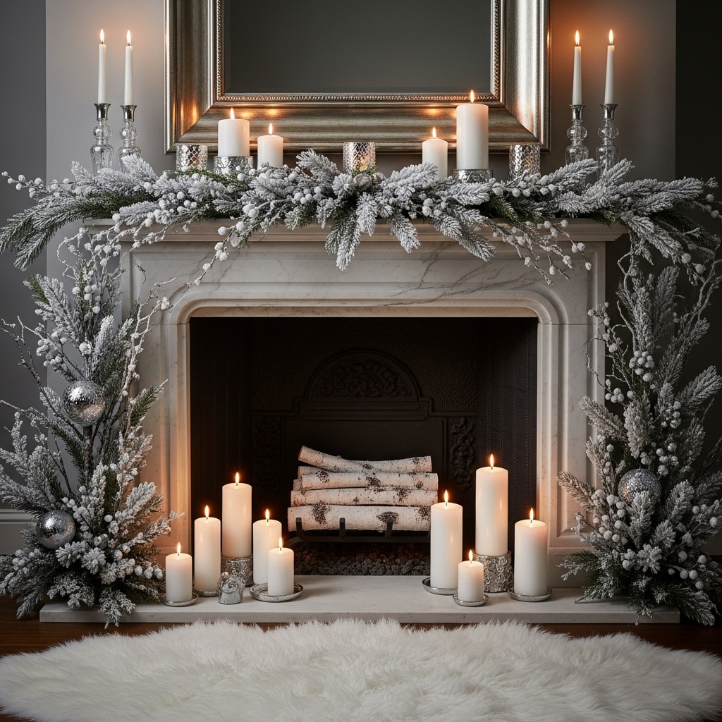 Draw inspiration from winter landscapes with frosted greenery, pine branches, and white faux snow décor. White candles and silver or crystal accents can evoke the magic of a snowy day, ideal for a serene and elegant hearth.