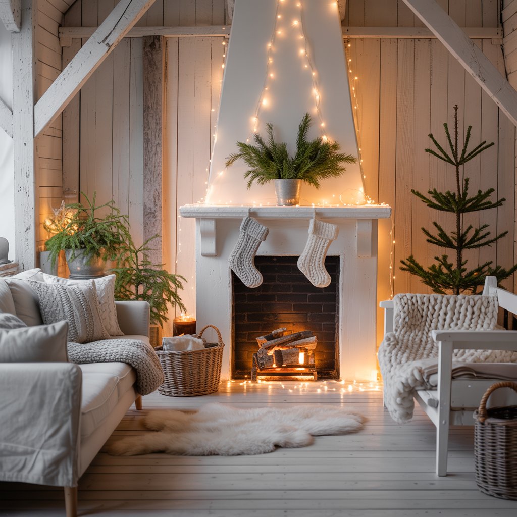 Scandinavian style is all about simplicity and warmth. Use whitewashed wood, soft neutral tones, and natural greenery complemented by wool throws or knitted stockings. Fairy lights add a magical glow around the fireplace creating an intimate, hygge atmosphere.