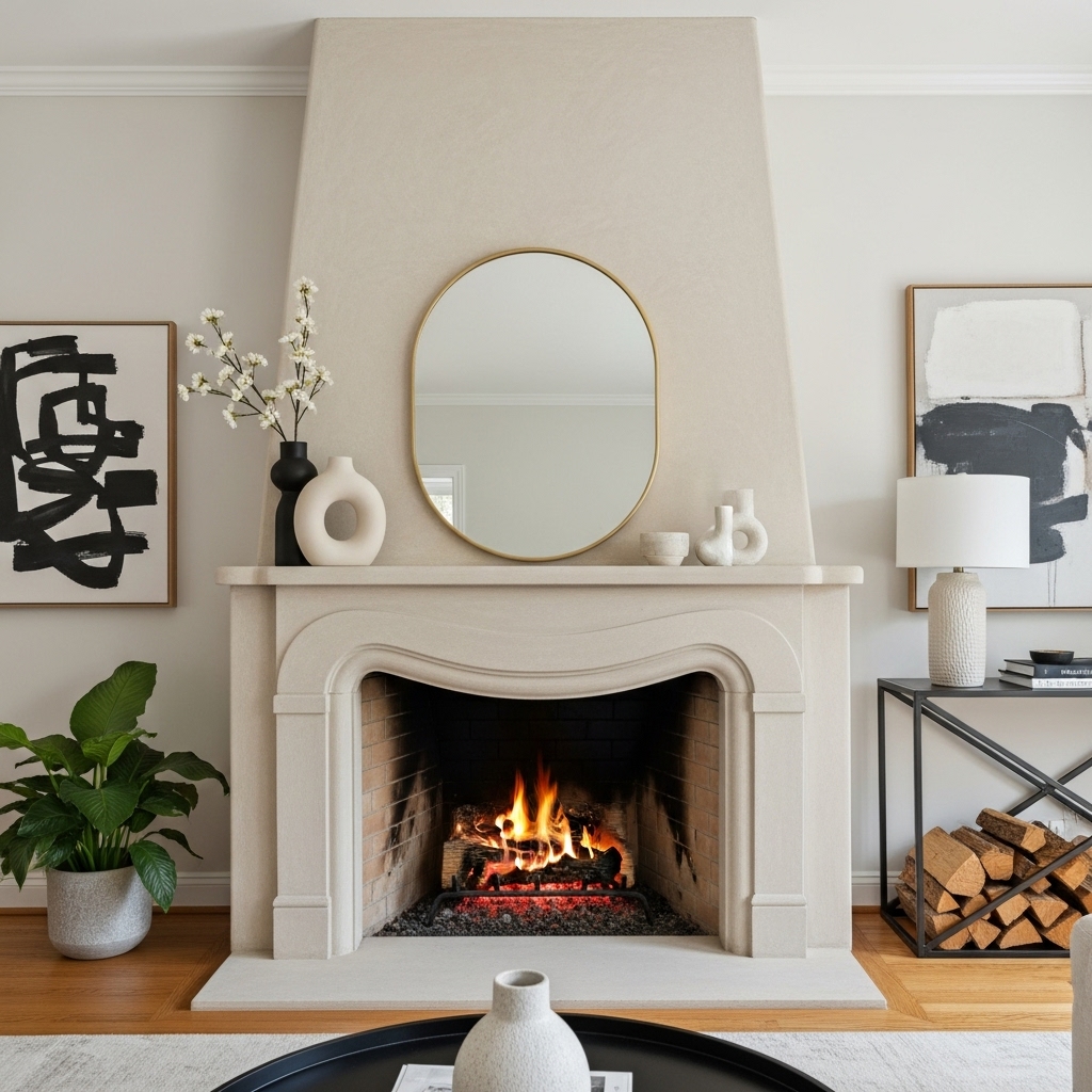 A sculptural vase, abstract artwork, or an elegant mirror can echo the fireplace’s curves or texture, enhancing its presence without overpowering it. Let the architectural details speak through thoughtful restraint, creating a balanced focal point that feels intentional, sophisticated, and effortlessly expressive of your home’s unique character.